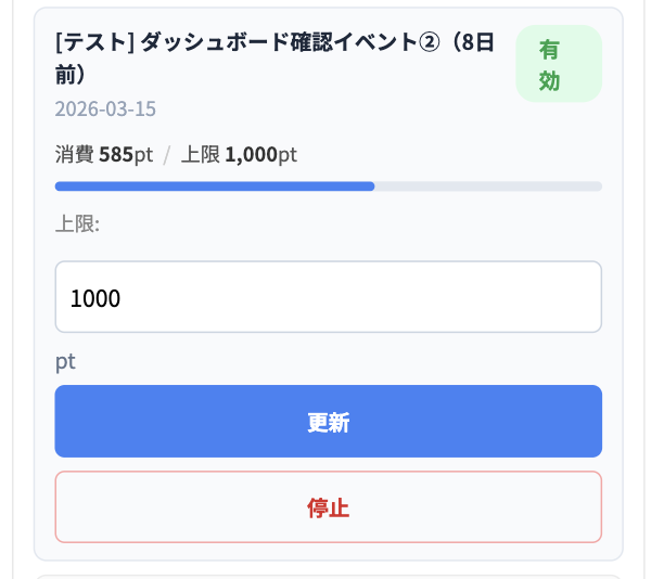 イベントページのダッシュボードより、消費上限に、適応させたいポイント額を入力し、更新ボタンを押すと、ポイントの付与が完了します。