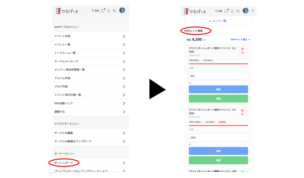 各イベントページの「メニュー」→「ダッシュボード」からも、そのイベント個別のPRポイント設定が可能です。