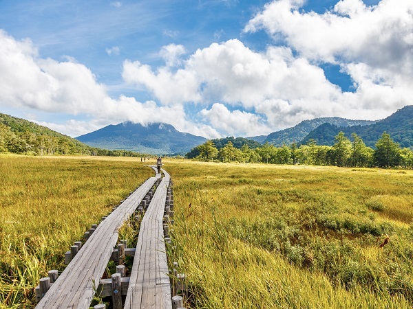 群馬県や栃木県などにまたがる広大な国立公園の尾瀬ヶ原。燧ヶ岳や至仏山など日本百名山の山々に囲まれ、本州最大の湿原のひとつです。山小屋もたくさんあるので、定番コースをのんびりと一泊しながら楽しめます。