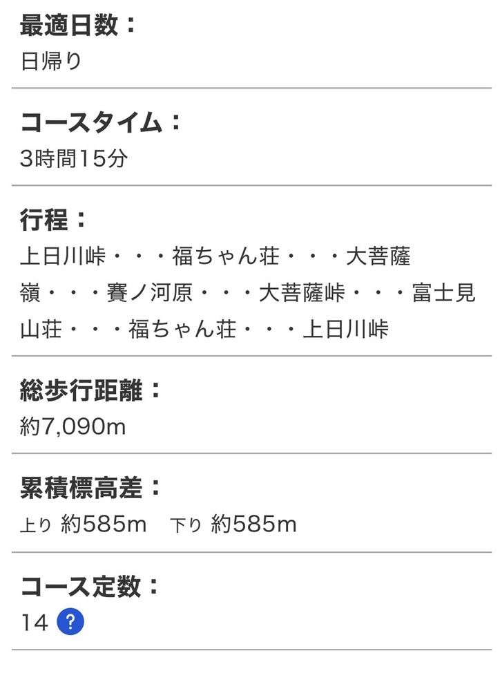 ・集合場所→車で移動→上日川峠→登山開始→雷岩→大菩薩嶺→大菩薩峠(ランチ)→バイカオウレンのスポット→下山→車で移動→日帰り温泉→20:00頃JR大月駅(解散)