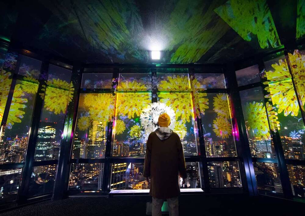 メインデッキからの美しい夜景を背景に、その窓面に優美かつ壮大に投映されるイメージは、室内に居ながらにして日本的な四季を感じさせます🐣🐣🐣