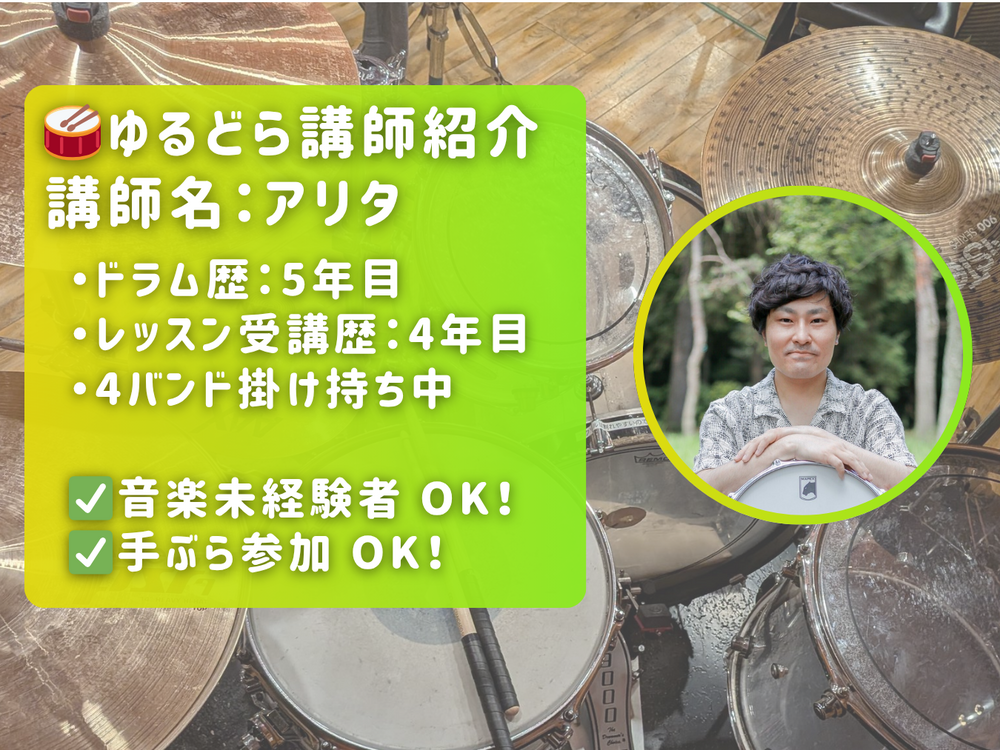 プロではありたせんが、4幎以䞊ドラムレッスンを受けおきた経隓を掻かしお、初心者の方が安心しおドラムに觊れられる堎を぀くりたいず思い、この䜓隓䌚を䌁画したした