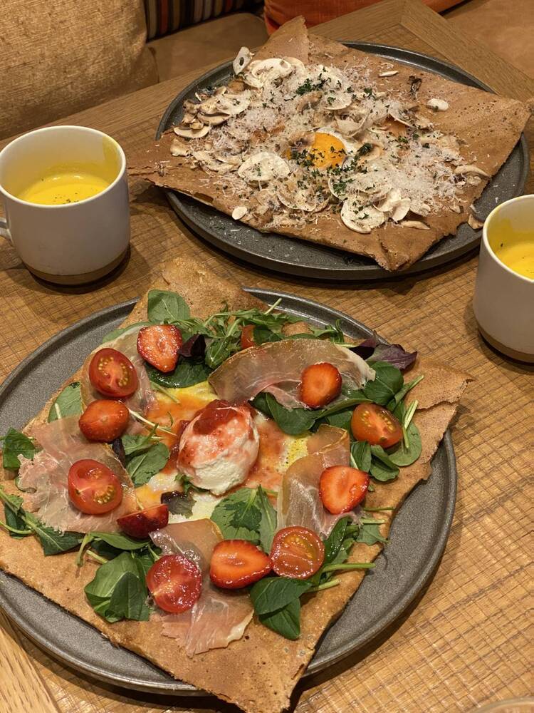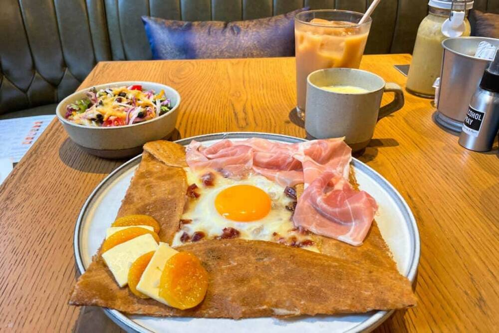 そば粉の生地を高温の鉄板で薄く焼き、ハムや卵、野菜などを具材にし、食事として楽しみます🍞🍞