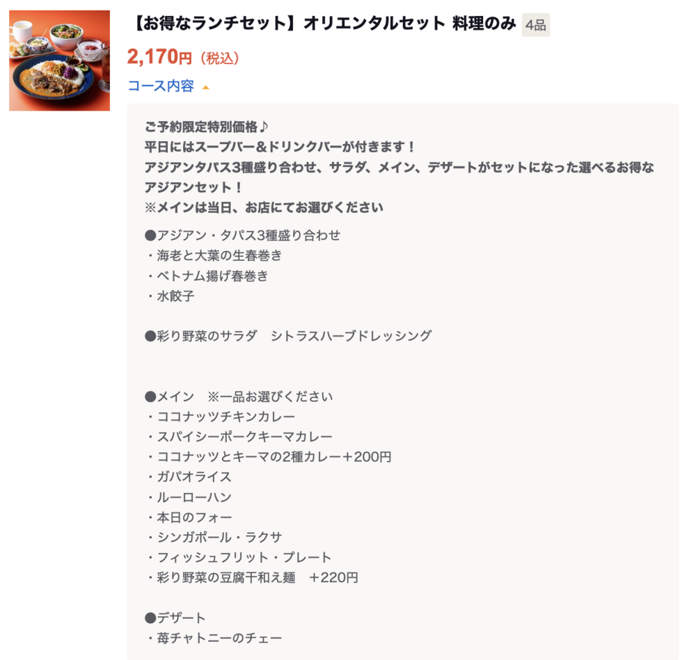以下のオリエンタルコースを 2,170円 でいただくことができます。